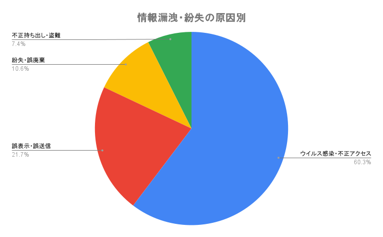 原因別の統計では、「ウイルス感染・不正アクセス」が最多の114件(60.3%)。一方で注目すべきなのが、「紛失・誤廃棄」が20件(10.5%)、「不正持ち出し・盗難」が14件(7.4%)と、物理的な持ち出しや内部の運用不徹底が一定割合で存在していること。