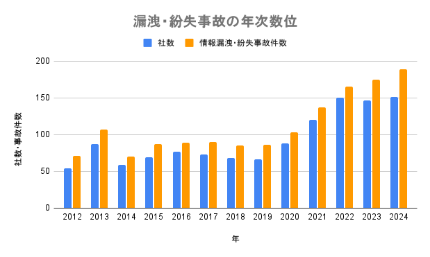 最新のデータとなる2024年では、情報流出の総数を示す「個人情報漏えい・紛失」事故は189件でした。事故を起こした企業の数は151社で、いずれも過去最多を更新しています。
